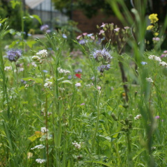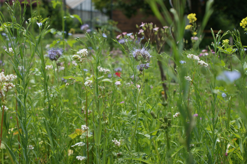 Natürlich haben wir auch unsere fleißigen Helfer die Wildbienen nicht vergessen und ihnen einige Quadratmeter Wildblumenwiese eingerichtet auf denen wir sie nun wunderbar beobachten und bestimmen können..